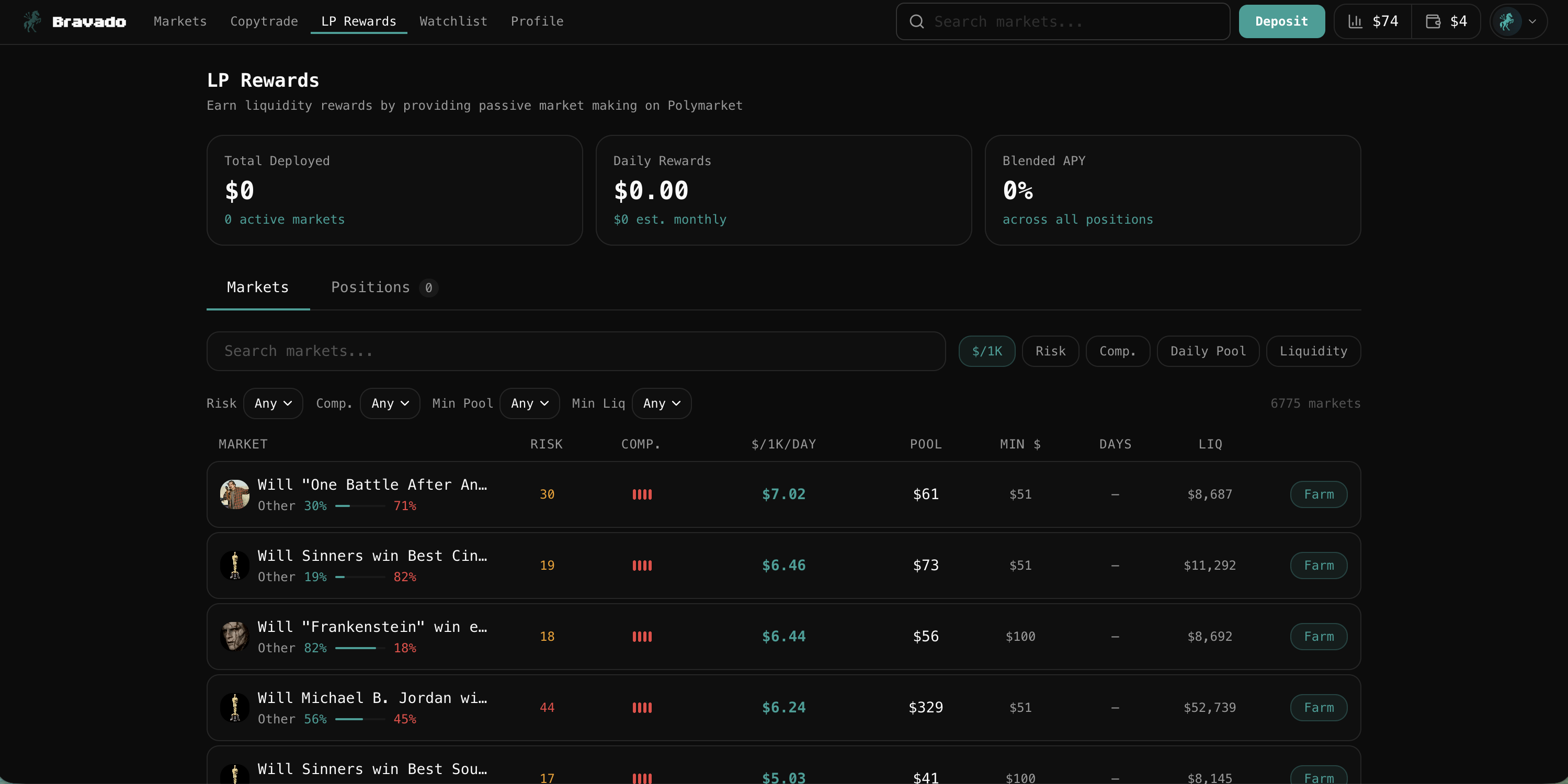 LP farming tools include composite risk scoring across every incentivized market, auto-replace for filled orders, and a full dashboard showing total deployed capital, daily rewards, and blended APY across all positions.