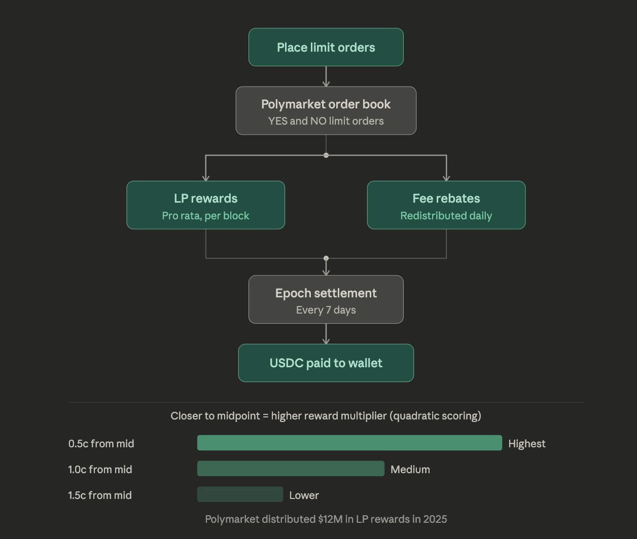 Polymarket distributes LP rewards in 7-day epochs. At the start of each epoch, Polymarket designates a pool of USDC rewards across a selection of qualifying markets. The first epoch distributed approximately 50,000 USDC and 10,000 UMA to participants. In 2025, the total LP reward pool reached $12 million across all epochs.