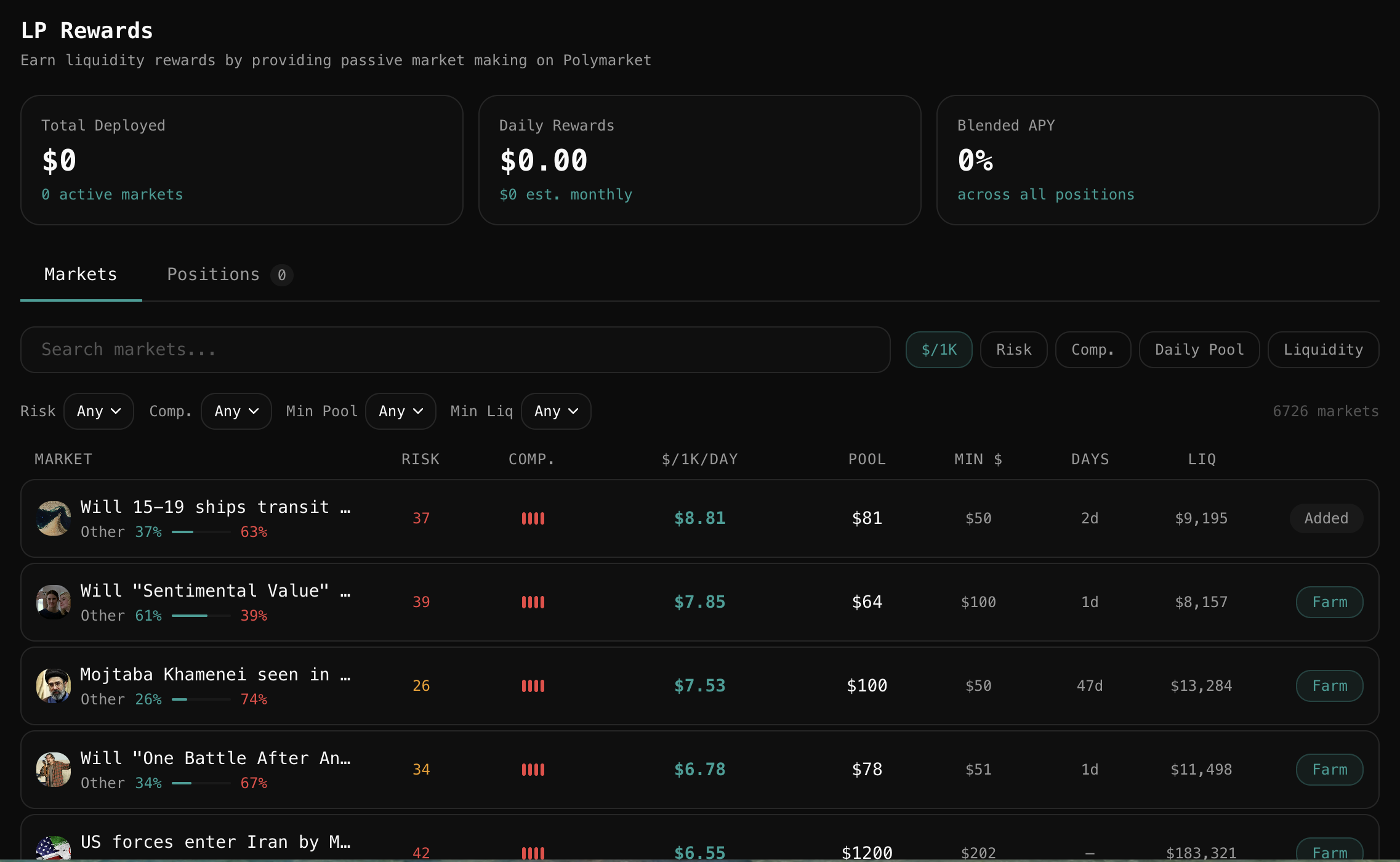 Market selection is where most of the LP farming edge is made or lost. The reward pool distribution across markets changes each epoch, and not every incentivized market represents a good risk-adjusted opportunity.