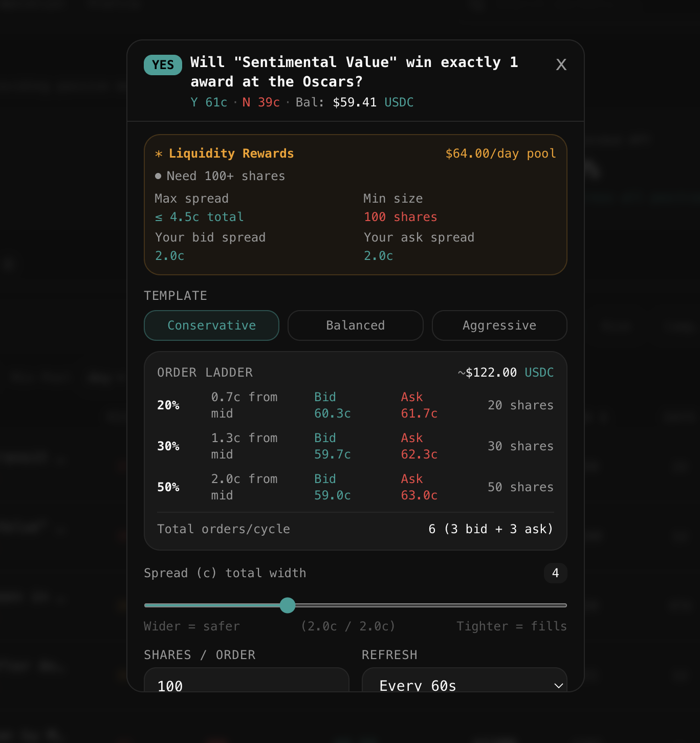 The Conservative template allocates 20% of capital at 1c from mid, 30% at 2c, and 50% at 3c. It prioritizes capital protection. Your orders sit further from the midpoint, reducing fill risk while still qualifying for rewards.