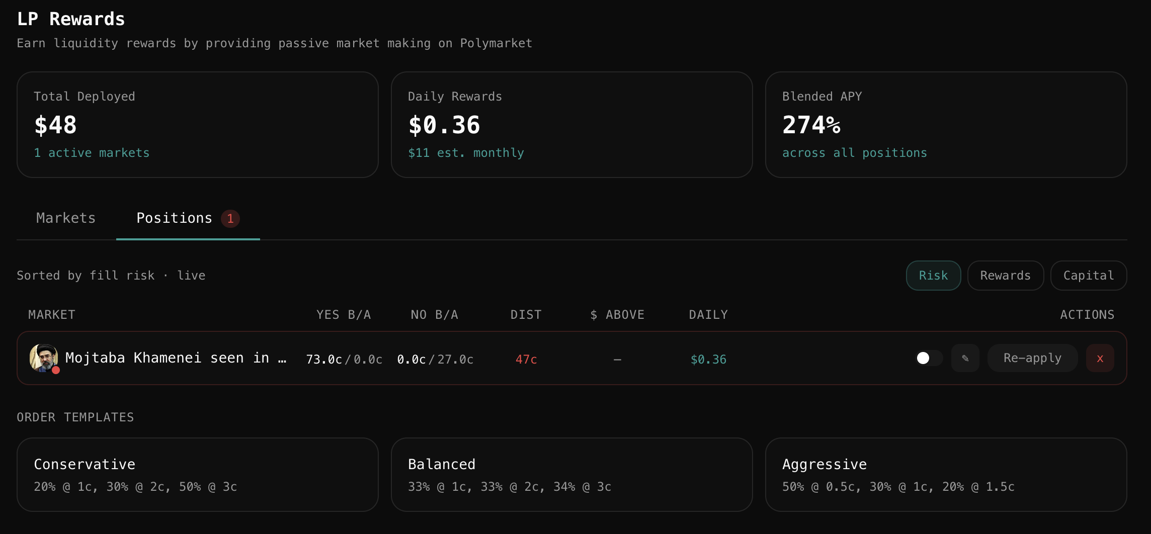 The combination of templates, auto-replacement, re-apply, and risk scoring means LP farming, which previously required the attention of a professional market maker to do well, becomes a systematic strategy any serious Polymarket participant can run alongside their directional trading activity.