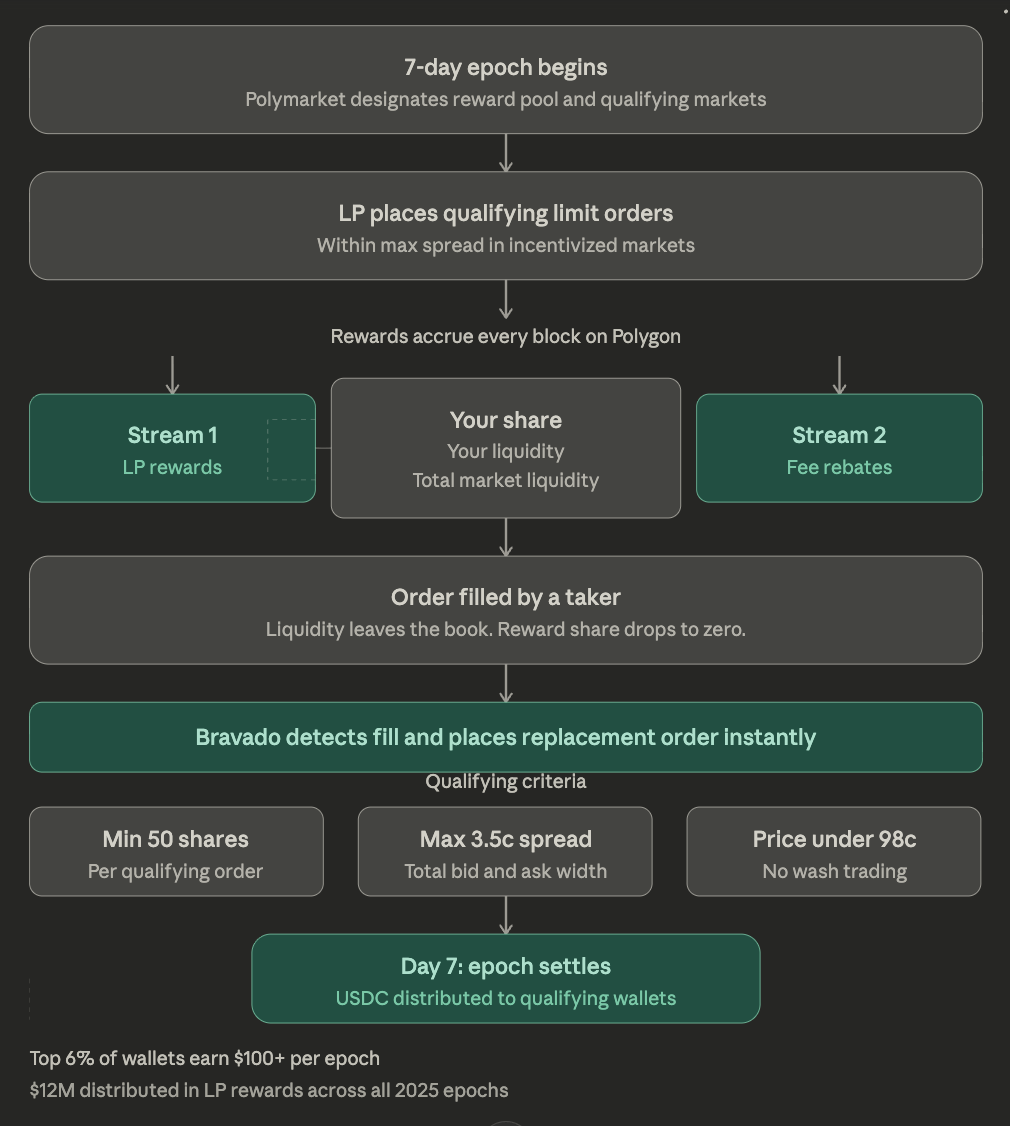 This post covers exactly how Polymarket LP farming works, how the epoch and reward structure is designed, what the risks are, and how Bravado's LP farming tools automate the entire process.