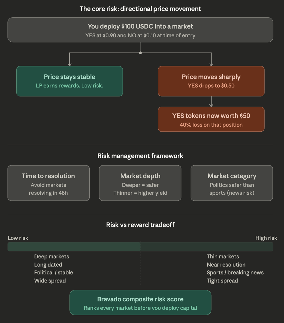 The core risk is directional price movement. When you provide liquidity to a Polymarket market, you are posting orders on both the YES and NO sides. If the market moves significantly in one direction before you can update or withdraw your positions, the outcome tokens you hold can lose substantial value.