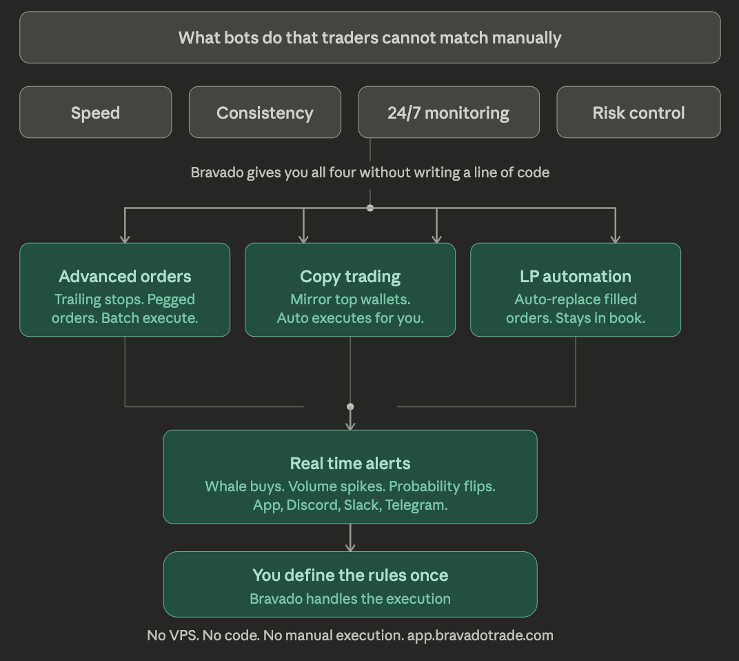 The four things bots do better than manual traders are speed, consistency, monitoring scale, and risk enforcement. A bot can watch 200 markets simultaneously, fire an order within milliseconds of a signal, replace a filled limit order before the next block, and enforce position limits that a manual trader would override in the heat of the moment.