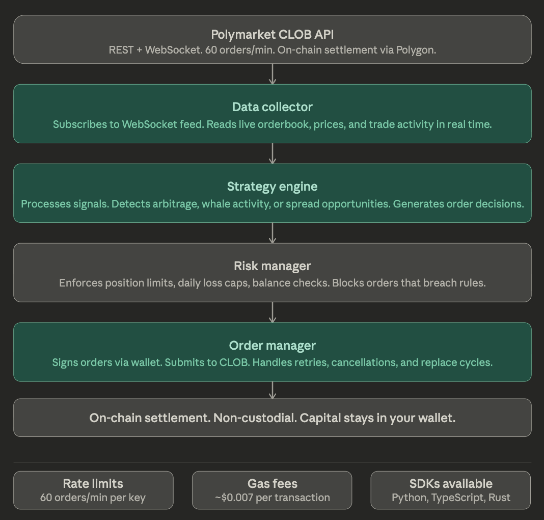 A production bot architecture typically follows four modules. A data collector subscribing to the WebSocket feed for real time orderbook and trade data. A strategy engine processing signals and generating order decisions. An order manager handling signing, submission, and retry logic against the CLOB. And a risk manager enforcing position limits, daily loss caps, and balance checks before any order reaches the API.