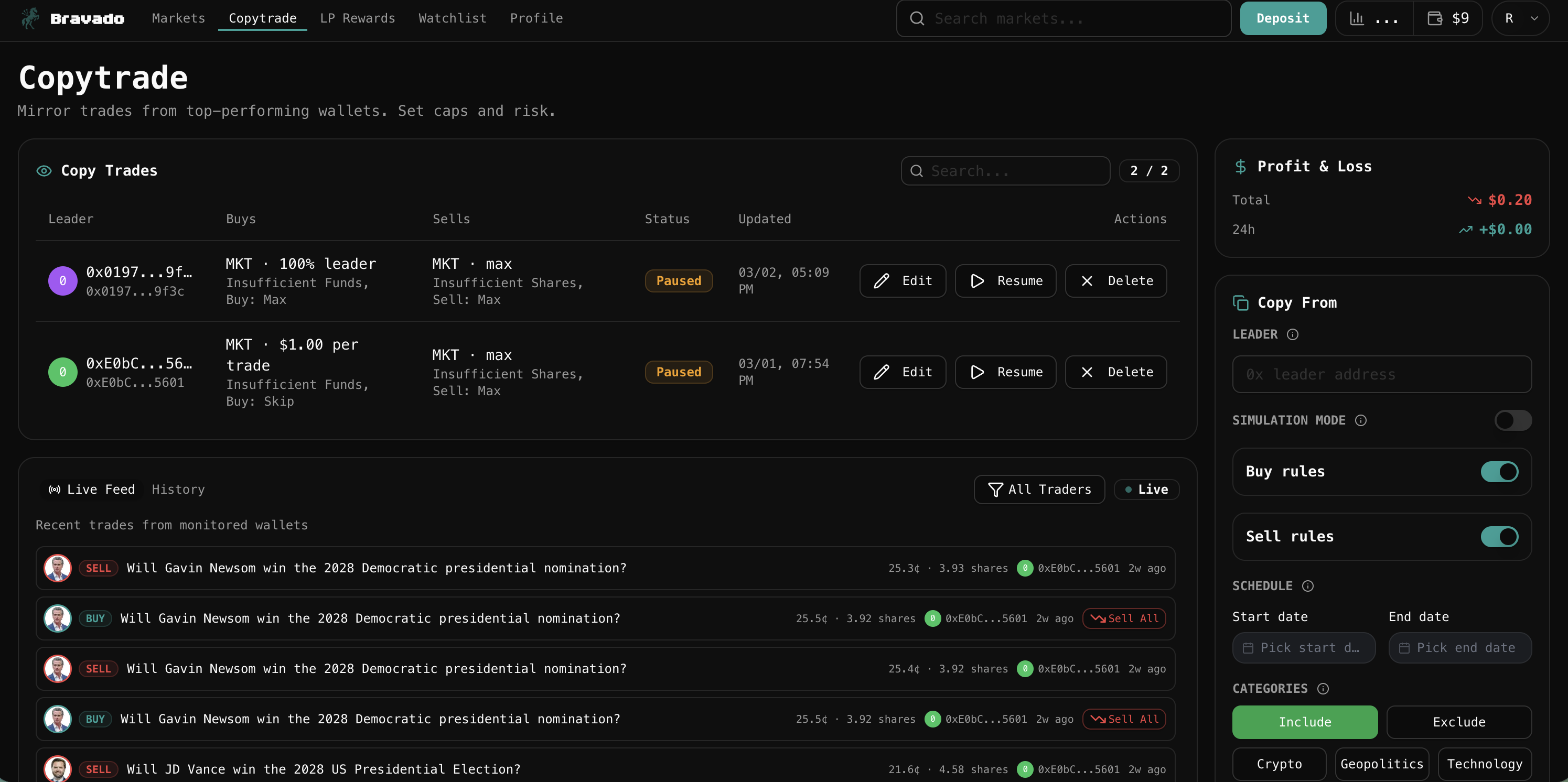 Copy trading as a systematic strategy. Bravado's copy trading feature is functionally a bot for following smart money. Define the wallets you want to mirror, set your sizing parameters, and Bravado executes the same positions automatically the moment those wallets enter a market. You are not placing orders manually. The system is.