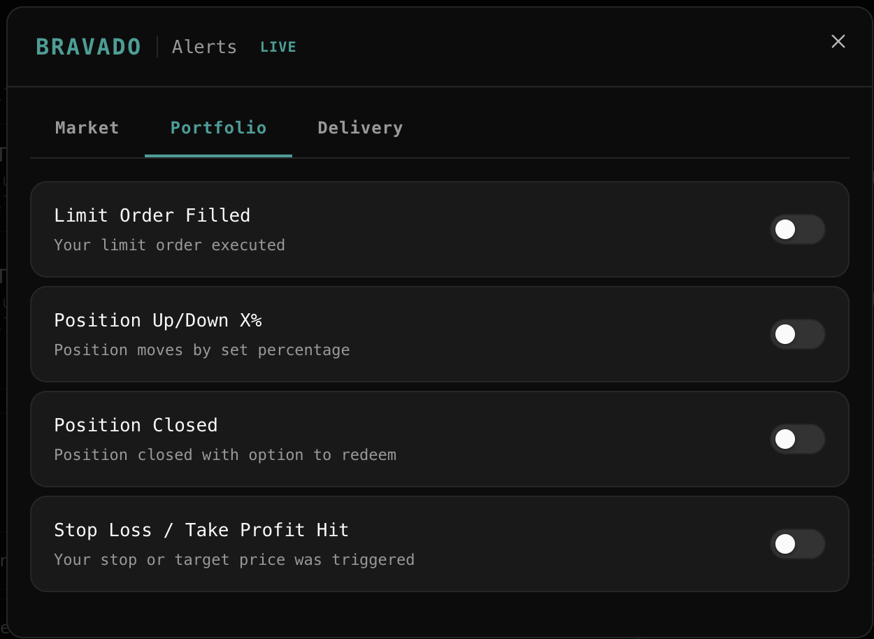 Real time alerts as triggers. Rather than a bot that acts autonomously, some traders prefer to be the decision layer with automated monitoring doing the detection. Bravado's alerts system surfaces whale buys, volume spikes, probability flips, and portfolio events in real time via app, Discord, Slack, or Telegram. You get the signal instantly. You decide whether to act.