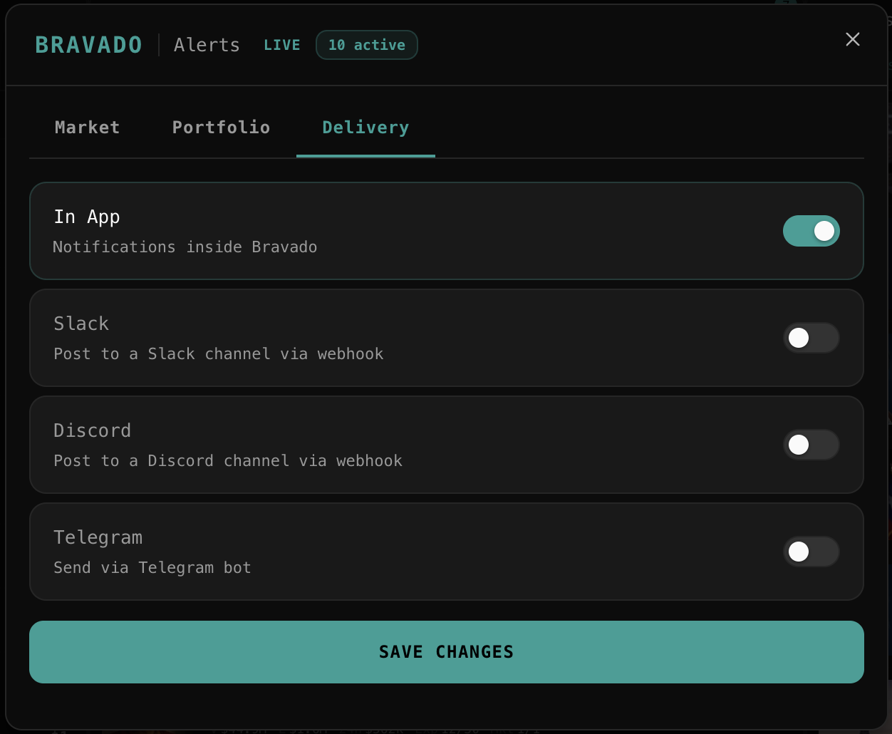 In-app notifications arrive inside the Bravado terminal itself. Slack delivery posts to any channel via webhook, making it straightforward to route market signals into a trading workspace. Discord delivery works the same way, ideal for traders who operate out of Discord communities. Telegram delivery sends alerts via bot, which suits traders who prefer mobile and want alerts that reach them anywhere.