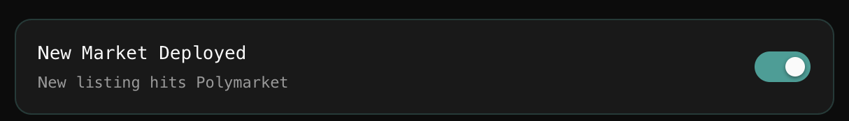 New Market Deployed fires the moment a new listing hits Polymarket. For traders who want first mover advantage on fresh markets before liquidity builds and prices tighten, being first to see a new deployment is a genuine edge.