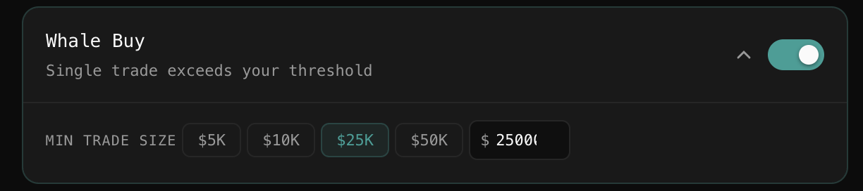 Whale Buy triggers when a single trade in a market you are watching exceeds your configured threshold. You set the minimum size. Bravado watches the on-chain activity and fires the alert the moment a qualifying trade lands. Pair this with the Bravado watchlist and you have a complete smart money monitoring layer.