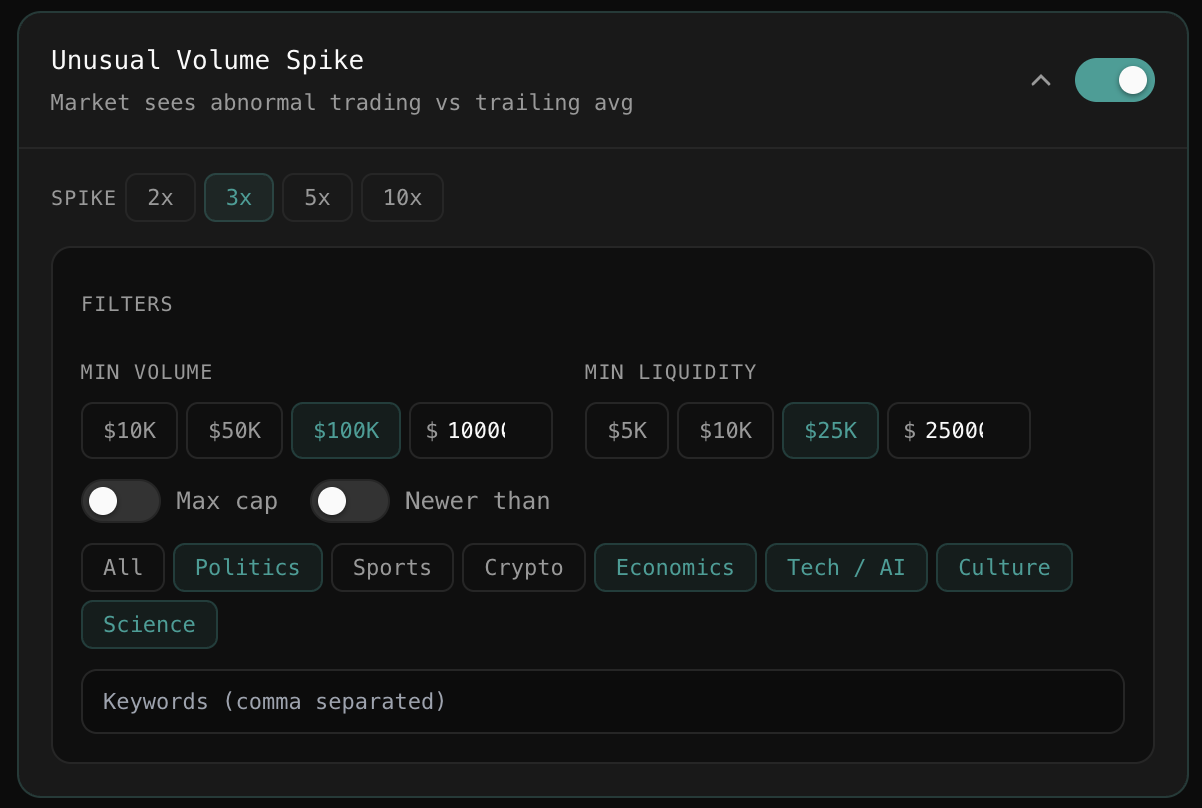 Unusual Volume Spike detects when a market sees abnormal trading activity relative to its trailing average. This is often the first signal that something is happening in a market before the probability has moved to reflect it. A spike in volume before a price move is exactly the kind of leading indicator that is invisible without real time monitoring.