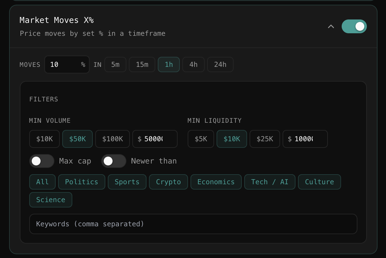 Market Moves X% lets you define a percentage threshold. When a market moves by that amount within a set timeframe, the alert fires. Useful for markets you have positions in as well as markets you are considering entering.