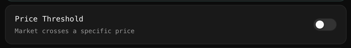 Price Threshold is simpler and more precise. Set a specific price level on any market. When the implied probability crosses that level, you are notified. The prediction market equivalent of a price alert on a stock.