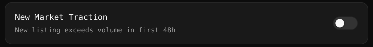 New Market Traction fires when a newly deployed market exceeds a volume threshold within its first 48 hours. It filters for the new markets that are actually getting attention, not just any new listing.
