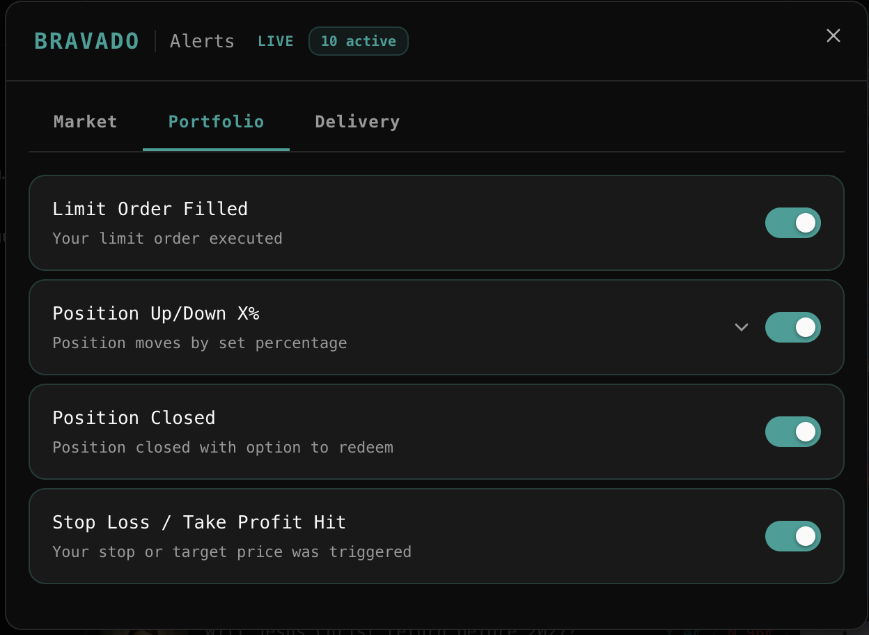 Bravado's alerts system is built around one idea: every signal that matters on Polymarket should reach you the moment it happens, not when you happen to check. With 10 active alert types across market signals and portfolio events, delivered to wherever you actually pay attention, it is the most comprehensive real time notification layer available for Polymarket traders.