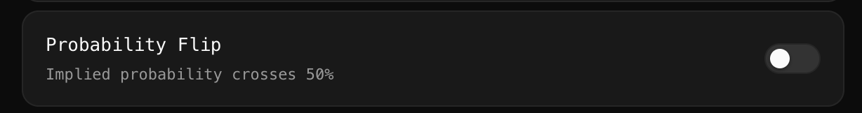 Probability Flip triggers when a market crosses the 50% implied probability threshold in either direction. When a market flips from likely NO to likely YES or vice versa, the narrative has changed. This alert captures that moment.