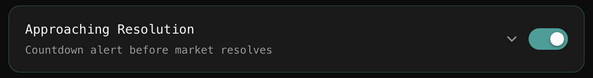 Approaching Resolution is a countdown alert that fires before a market you hold a position in resolves. Gives you time to review, exit, or add before settlement.