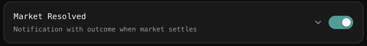 Market Resolved delivers a notification with the outcome the moment a market settles. Useful for positions across many markets simultaneously, where manually checking every resolution is impractical.