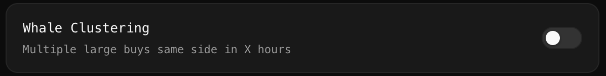 Whale Clustering detects when multiple large buys land on the same side of a market within a defined time window. One whale entering a market is a signal. Three whales entering the same side within a few hours is a different kind of signal entirely.