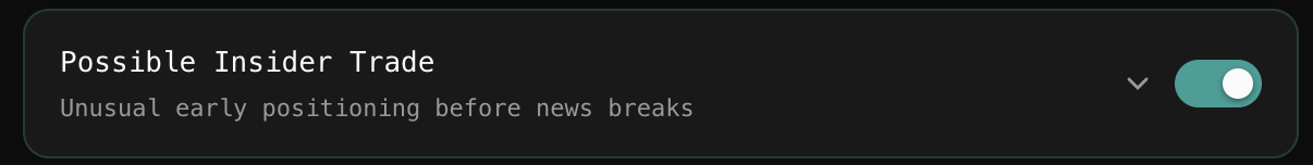 Possible Insider Trade flags unusual early positioning before news breaks. When a market sees atypical activity in advance of a known catalyst, this alert surfaces it so you can assess whether the move reflects information or noise.