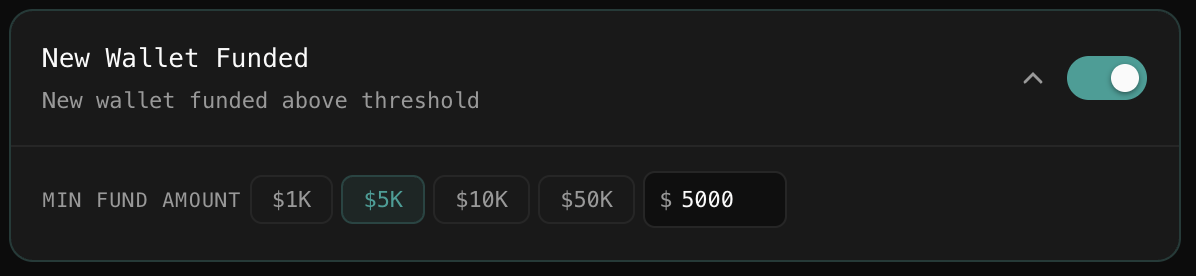 New Wallet Funded fires when a new wallet is funded above your configured threshold. A freshly funded large wallet entering the platform often precedes significant positioning activity.