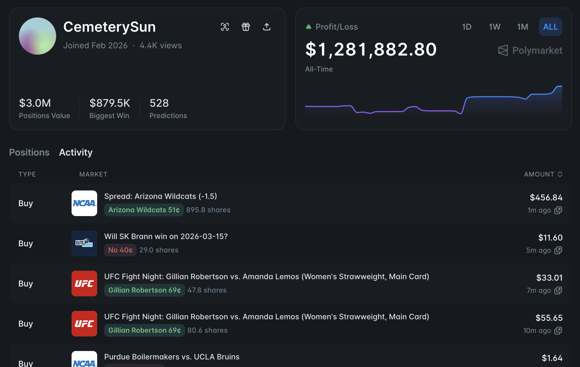 Check the track record first. A large position from a wallet with a verified history of 65%+ win rates across 200 or more settled markets is a meaningful signal. A large position from a wallet that got lucky once on a single outcome is not. The on-chain record tells you which is which. Look at win rate, consistency across time periods, and whether their edge is concentrated in specific market categories.
