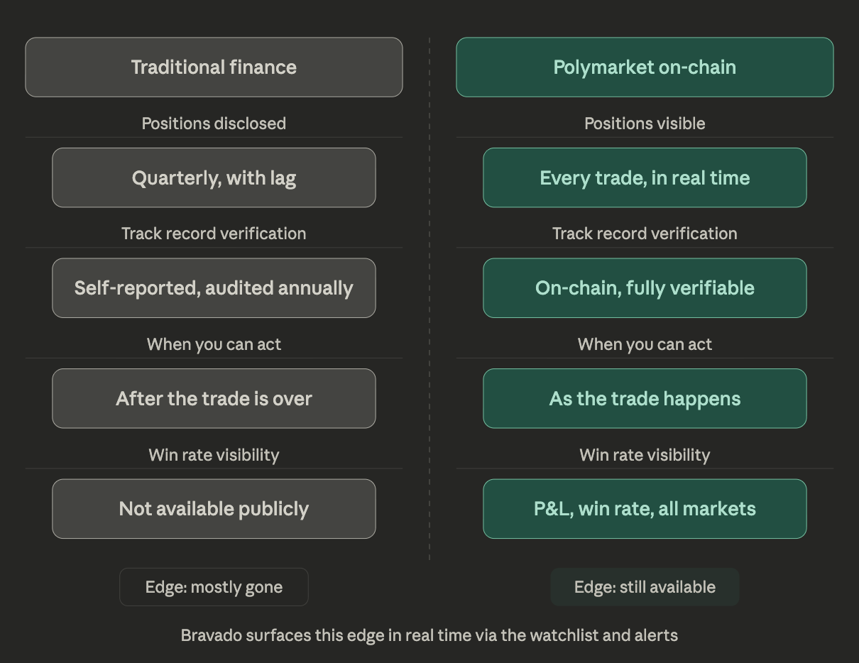 On Polymarket, every wallet's complete trading history is visible on-chain. You can verify a trader's win rate, total profit and loss, and consistency before acting. That level of transparency does not exist in traditional markets.