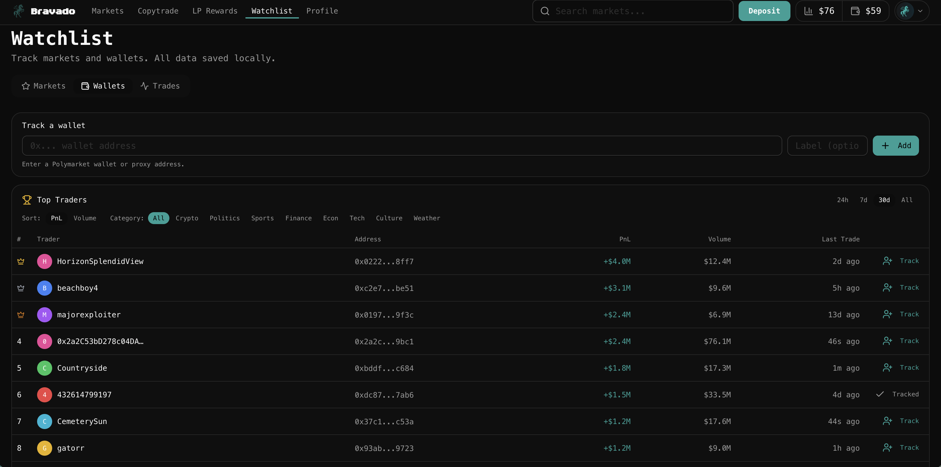 The Top Traders leaderboard surfaces the highest performing wallets on Polymarket ranked by PnL, with volume, wallet address, and time of last trade visible at a glance. You can filter by category, whether that is crypto, politics, sports, finance, or others, and sort by PnL or volume across 24 hours, 7 days, 30 days, or all time. When you find a wallet worth watching, one click adds them to your tracked list.